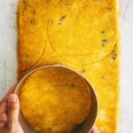 - Use the cake ring to stamp out two 6-inch circles from the sheet cake, then reserve the remains for the first layer of the cake. (Work Time: 5 minutes)