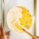 - Frost the top layer of the Milk Bar chocolate chip cake with the remaining coffee frosting. Use the back of a spoon or a small rubber spatula to spread the remaining coffee frosting as evenly as possible over the top layer. Again, don't worry about making the frosting smooth! You'll cover it with mini chocolate chips in the next step.