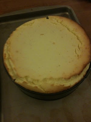 Agh! It seemed like I had used a pan that was way too small for the cheesecake. The sides had puffed up and cracked dramatically! I frantically googled “puffed up cheesecake” to see if I had screwed up somehow. ‘No matter’, About.com’s Baking Tips for the Perfect Cheesecake, advised me. ‘A perfectly cooked cheesecake will be puffed up on its sides. This bloating will reduce when the cake is cooled. Just be sure to carefully cool the cake.’