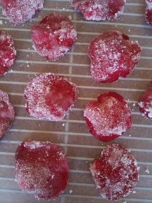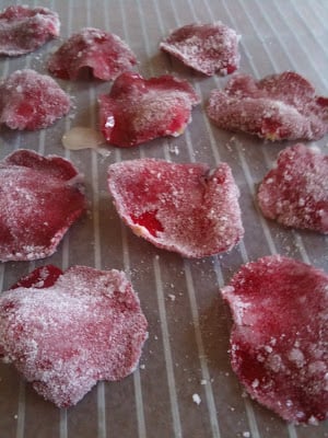 Sure, they looked good. But taste was another matter entirely. It turns out that rose petals are actually pretty bitter on their own; one needs a LOT of sugar to cut out the bitter aftertaste. My process of candying the rose petals in bulk failed miserably. The egg and sugar had mixed together during my frantic stirring and had created a shiny, tasteless gloss on the petals. It turns out the only GOOD candied rose petals are the ones that are extraordinarily crystallized in texture (as seen below):