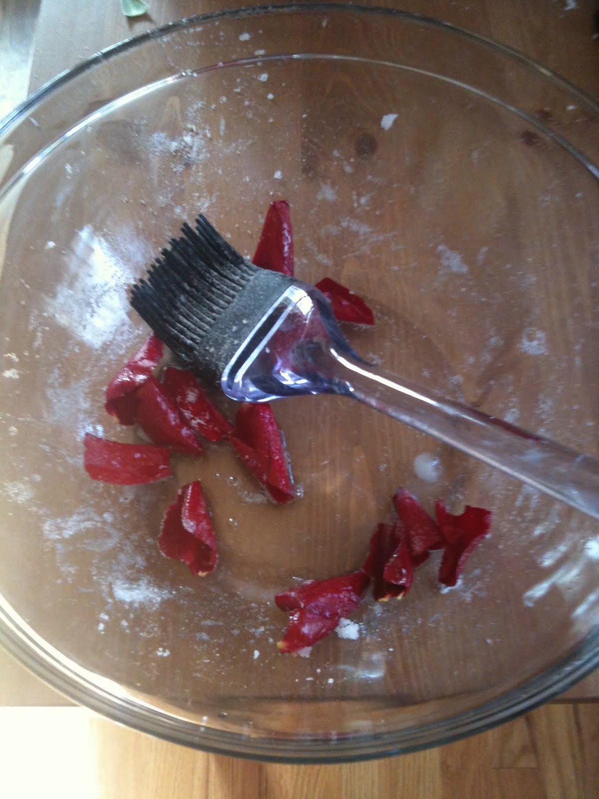 However, be warned. Each rose yields about 20-30 individual petals – it is a bit of a time consuming process, brushing each delicate petal’s side with egg white an dipping it into sugar. The sugar also begins to clump in the bowl, creating a giant mess. If you’re a lazy sack like I am, I thought I would be able to get away with creating some weird egg-sugar mixture and brushing the petals all at the same time. So I dumped a boatload of petals in a huge bowl, poured in some egg white, and tossed in some sugar and stirred everything together.