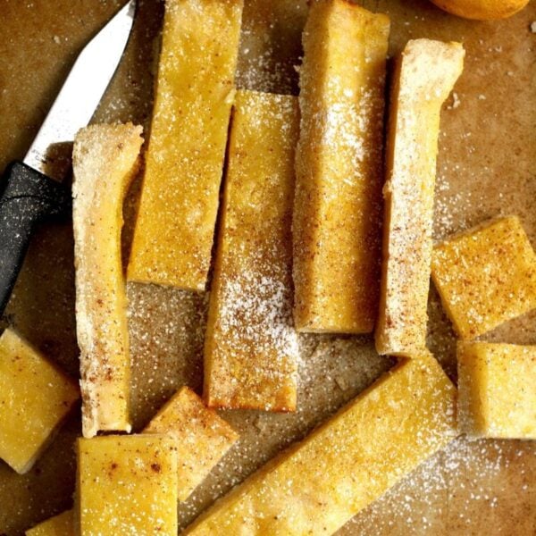 These bars have all the elements of a lemon bar that I really enjoy: lemony, tangy, gooey, and not too sweet. I think I like these a lot because they are actually more shortbread cookies with a lemon topping? For instance, I’d say that the cookies are actually 3/4 lemon shortbread and 1/4 lemon custard. The perfect ratio. Don’t forget to top off with a sprinkling of powdered sugar, cinnamon, and ground ginger to give these babies a unique flavor.