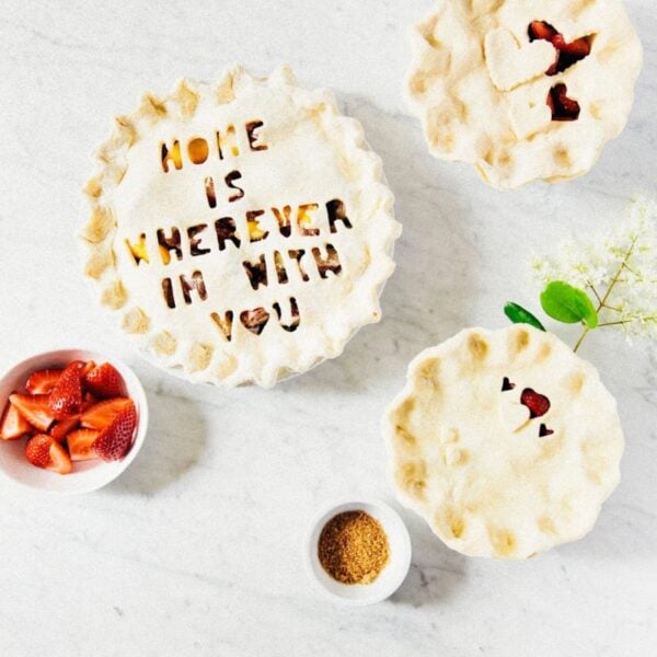 - Next, make the pie lid. If making a 9-inch pie, roll out the other disk into a 12-inch circle about 1/8 to 1/4-inch thick; if making a 5-inch pie, roll into a rough 8-inch circle. If using cookie cutters to stamp out any shapes or designs onto your lid, this is the time to do it! I recommend these mini alphabet cutters if you want to stamp out any indie folk song lyrics like I did. If the lid starts to feel soft or sticky while you're doing this, transfer the lid to a sheet pan and freeze for 5 to 10 minutes until you've finished your pattern.