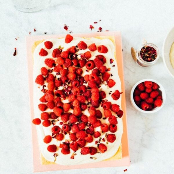 I’d like to tell you that I made this cake with raspberries from the farmer’s market around the corner from our apartment, but the truth is, I actually made this cake back when we were in Brooklyn and only got around to editing the photos and posting about it now. But it was so good that I’m seriously considering making it again, and I hope you do too! It’s a quick weeknight sheet cake, but made incredibly moist by the crème fraîche in the base and decadent with the white chocolate frosting and tart raspberries. Enjoy!