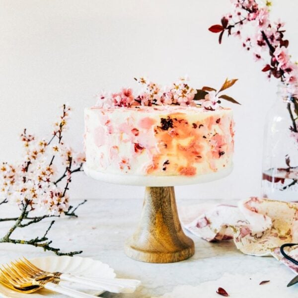 This cherry blossom cake is made with a delicately flavored cherry blossom butter cake. The vibrant pink cake is then decorated with cherry blossom-flavored frosting, complete with edible “petals” made with dabs of pink frosting. It’s the perfect treat to celebrate sakura season!