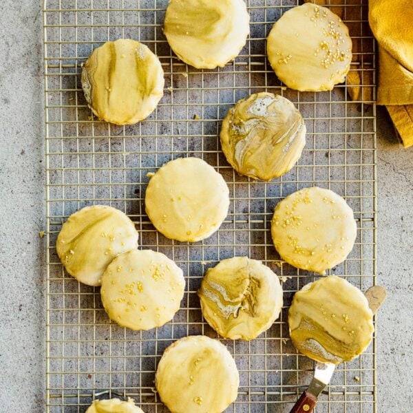 This year, I decided to glam up my shortbread cookie recipe with a “hot buttered rum” glaze to really amp up its buttery flavor. The glaze is made with a generous amount of brown butter and rum to give it lots of oomph. I then dipped each cookie in the glaze, after swirling the glaze with gold food coloring to achieve that marbled look. Needless to say, it was a success—these cookies were the first ones gone during our holiday swap! Be sure to check out my baker’s notes on how to bring these cookies together; even though they look super fancy, they’re actually an incredibly easy shortbread cookie recipe!