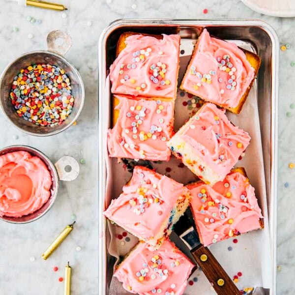 The tiny sheet cake starts with moist and fluffy white cake (made with all egg whites) studded with sprinkles. The sprinkles give the cake its unique crumb, dotting it with color. The cake batter is baked in a 9 x 5-inch loaf pan, yielding a small sheet cake with just 8 bite-sized slices. Each slice is then topped with a quick-and-easy creamy American buttercream frosting and of course, more sprinkles!