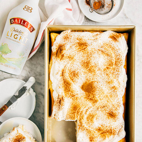Baileys tres leches cake is a boozy, Irish twist on tres leches cake, a classic Latin American dessert! This recipe starts with a light and airy Genoise sponge cake. I then instruct you to pour a combination of three different types of milkโsweetened condensed milk, evaporated milk, AND Baileys Irish Creamโover the cake. Overnight, the cake soaks up the three milks, becoming super moist and flavorful. To top it all off, we make homemade whipped cream and garnish the cake with cocoa and espresso powder.