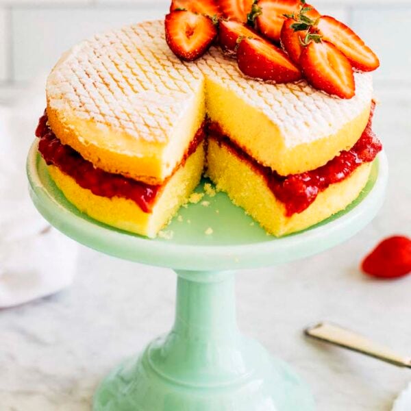 This 6 inch Victoria sponge cake recipe is a small batch version of the British classic! Two 6-inch yellow cakes, both with the texture of pound cake, sandwich strawberry compote made from seasonal fresh strawberries. Served warm, it’s fresh and delicious!