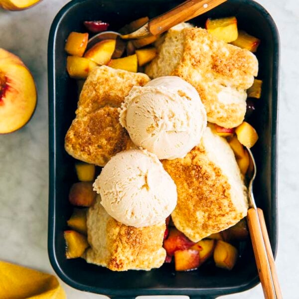 The best part about this biscuit peach cobbler is that it’s crazy customizable. I’ve included notes on how to substitute out the peaches with the other fruit of your choice, as well as how to scale the fruit up or down depending on your preferences. I’ve also included tons of notes on how to bake the recipe in different small pans like a 9 x 5-inch loaf pan, a 6-inch round cake pan, and more!