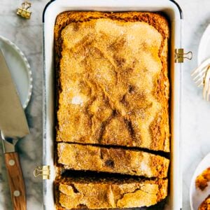 This pumpkin chai bread recipe is loaded with lots of chai spices like cardamom, cinnamon, ginger, clove, and nutmeg! These warming spices complement the pumpkin bread, resulting in a baked good that is neither too spicy or sweet. To top it off, the pumpkin bread is finished with a generous sprinkling of sugar to make its signature, crunchy sugar crust!