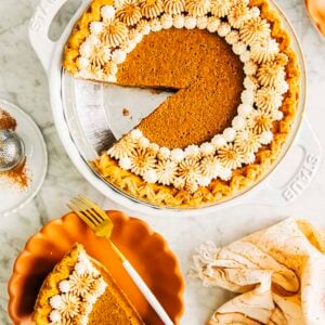 My best easy vegan pumpkin pie recipe is made with a coconut milk based pumpkin custard in a store bought vegan pie crust! The recipe comes together SO quickly—the custard comes together in less than 5 minutes! You can also customize the recipe by swapping out the crust for a homemade one, or even a gluten-free pie crust. It’s the perfect recipe for folks who want a quick-and-easy make ahead Thanksgiving dessert perfect for all diets and lifestyles.
