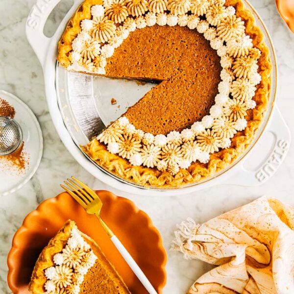 The pumpkin pie needs 45 to 50 minutes in the oven, or until the edges are set but the center of the pie wobbles ever so slightly. Unlike with conventional pumpkin pies, you don’t need to worry about potentially overbaking the pie and causing its filling to crack (that’s mostly an issue with eggs). However, you still want to ensure that it wobbles in the center so you don’t end up with an overly firm custard. It will continue to cook and set after you pull it out the oven!