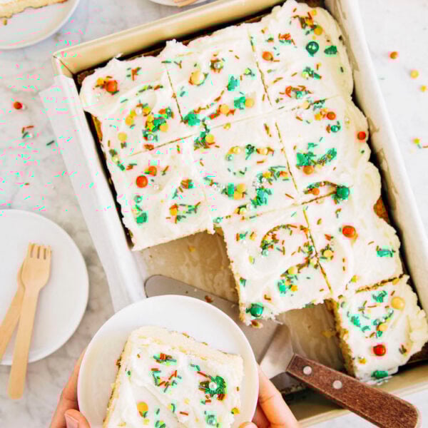 Eggnog cake is a fun, holiday twist on a classic yellow sheet cake with American buttercream frosting. The yellow cake recipe uses eggnog in place of buttermilk to make an incredibly delicious, moist, and lightly spiced eggnog-flavored sponge cake. And for extra flavor, I also instruct you to use eggnog in the frosting! Don’t forget to top everything off with your favorite holiday themed sprinkles.